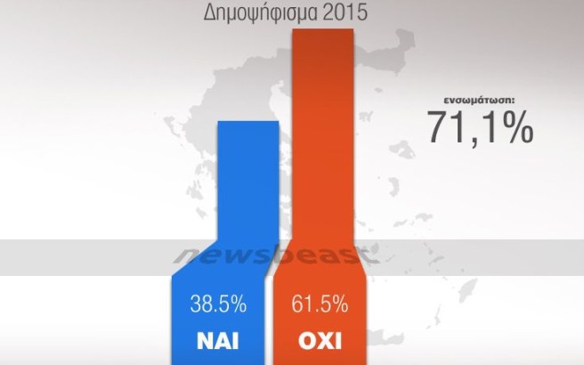 Στο 61,5% διαμορφώνεται το ποσοστό του «Όχι», σύμφωνα με τα αποτελέσματα του δημοψηφίσματος με καταμετρημένο το 71,1% των ψήφων.