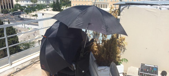 Ο ανταποκριτής του BBC βρίσκεται σε ταράτσα της πλατείας Συντάγματος και για να προστατευτεί από τον ήλιο αποφάσισε να ανοίξει ομπρέλα. Οχι μία αλλά δύο για να μπορέσει να αντέξει τον καυτό ήλιο.
