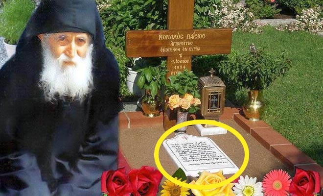 Ο Άγιος Παΐσιος στις 12 Ιουλίου 1994 εκοιμήθη εν Κυρίω και είχε ζητήσει να τοποθετηθεί στον τάφο του μία πλάκα με γραμμένα τα εξής: