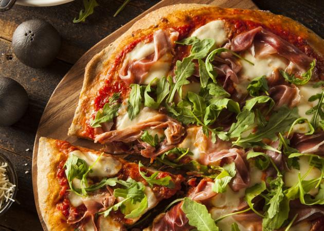 Άπλωσε πάνω το μείγμα με τα μανιτάρια, τη ρόκα, το προσούτο, τη μοτσαρέλα και την παρμεζάνα. Ψήσε για 10 λεπτά και αφαίρεσε από το φούρνο.