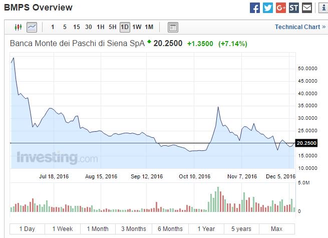 Οι πληροφορίες χθες ανέφεραν ότι η ιταλική κυβέρνηση σχεδιάζει να βοηθήσει την προβληματική τράπεζα Monte dei Paschi di Siena να αποφύγει τη χρεοκοπία και διάσωση-κρατικοποίησή της - που θα είχε οδυνηρές συνέπειες για τους (κυρίως απλούς ιδιώτες) πιστωτές της - μέσω της συμμετοχής της στην ανταλλαγή ομολόγων μειωμένης εξασφάλισης έναντι μετοχών της.